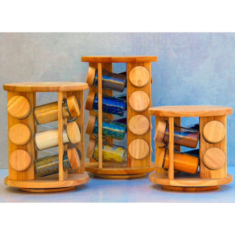 ساخته شده از چوب رابر دارای نقش و خلل و فرج طبیعی شامل 12 جا ادویه شیشه ای با درب چوبی هر یک به قطر 4 و ارتفاع 10 سانتیمر با خروجی ثابت قابلیت چرخش 360 درجه استند نگهدارنده به هر دو طرف شیک و ساده دارای جعبه ساخت کشور ایران