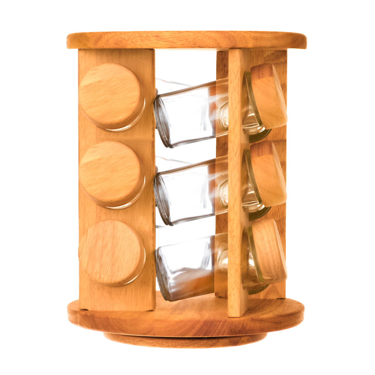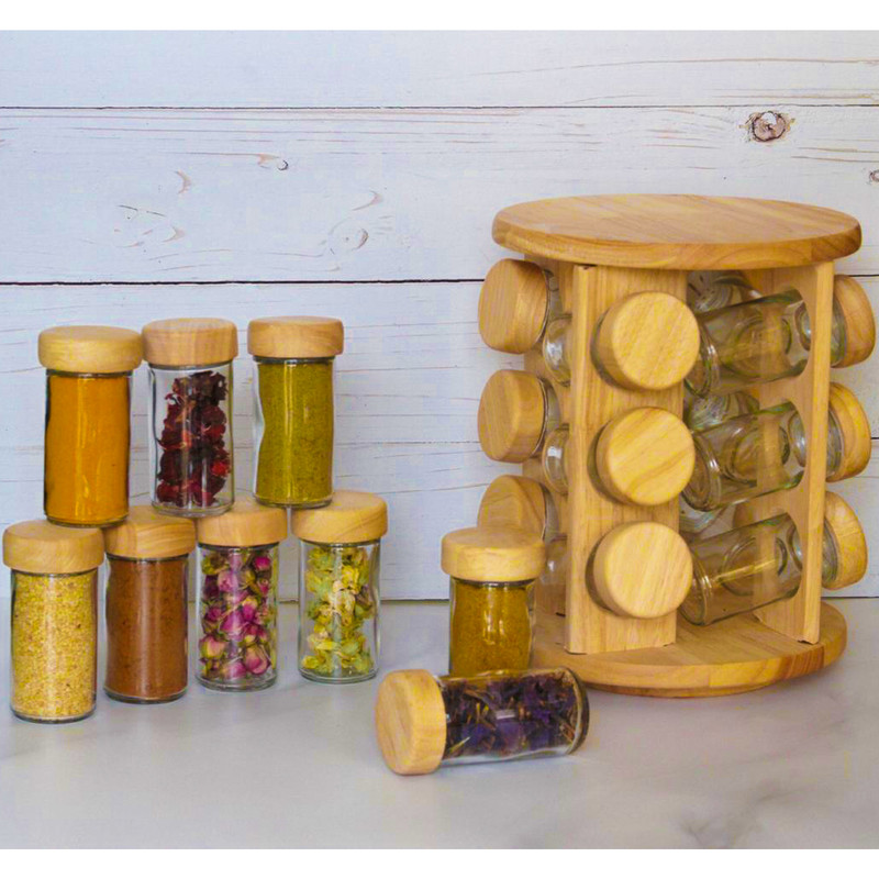 ساخته شده از چوب رابر دارای نقش و خلل و فرج طبیعی شامل 12 جا ادویه شیشه ای با درب چوبی هر یک به قطر 4 و ارتفاع 10 سانتیمر با خروجی ثابت قابلیت چرخش 360 درجه استند نگهدارنده به هر دو طرف شیک و ساده دارای جعبه ساخت کشور ایران
